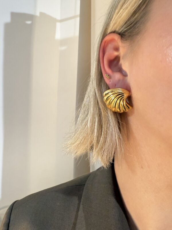 “Les boucles d’oreilles dorées effet vintage séduisent par leur éclat subtil et leur charme rétro. Un bijou intemporel qui rehausse chaque tenue d’une touche d’élégance raffinée.”