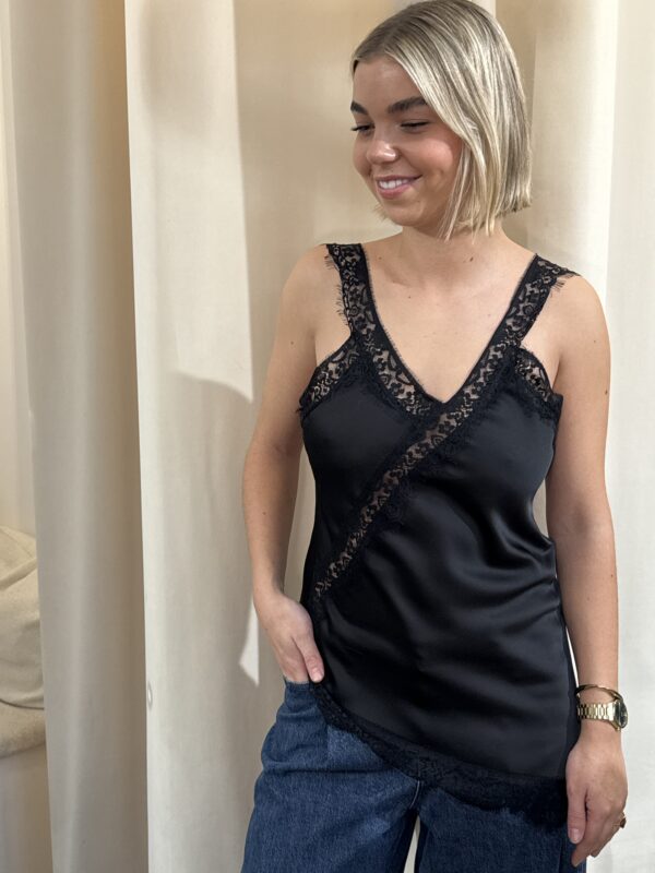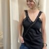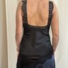 “Subtilement audacieux, le débardeur noir en dentelle asymétrique allie féminité et modernité avec justesse. Une pièce raffinée au design minimaliste qui apporte une touche de sensualité élégante à chaque tenue.”