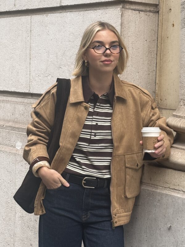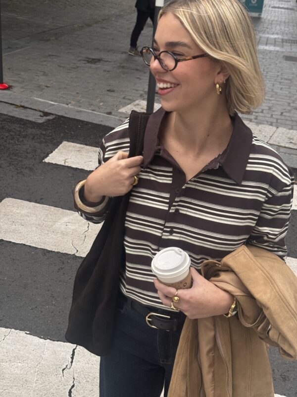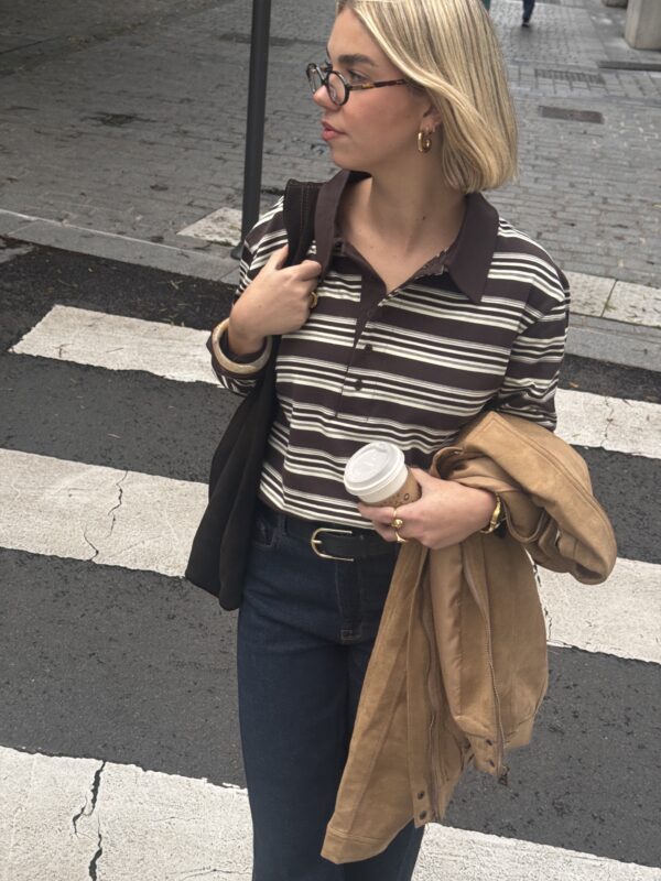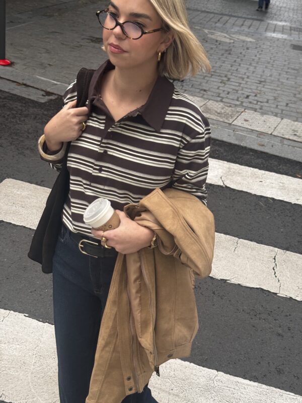 “Avec ses rayures et ses tons chauds, le polo rayé marron revisite un classique avec modernité. Une pièce polyvalente au style intemporel, parfaite pour une allure élégante et décontractée.”