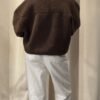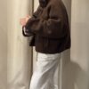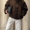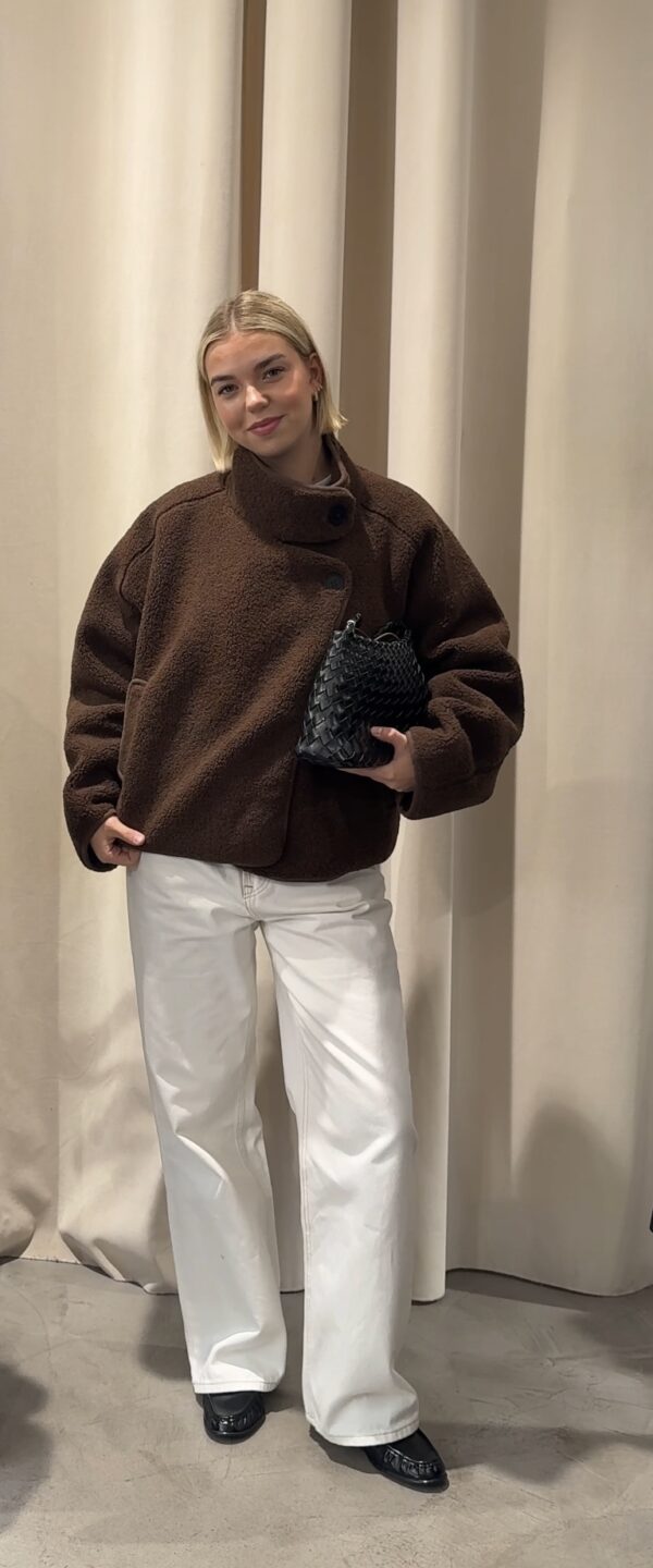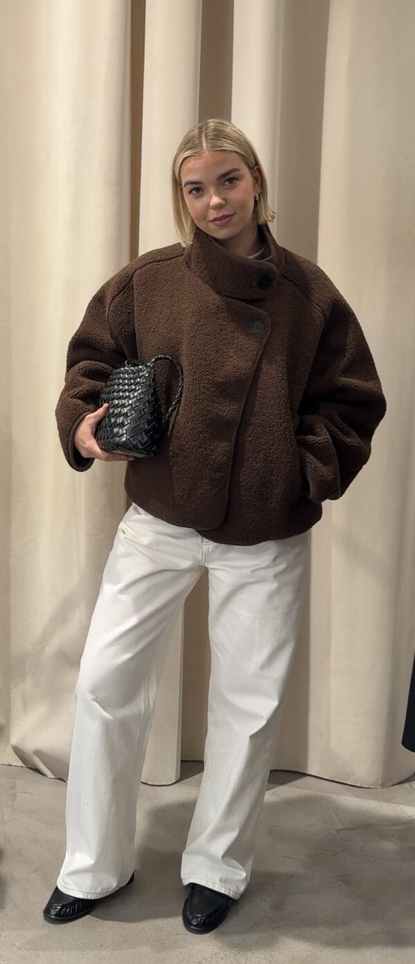 “Confortable et élégante, la veste marron en bouclette séduit par sa texture douce et son col montant structuré. Une pièce chaleureuse au style minimaliste, idéale pour un look moderne et sophistiqué.”